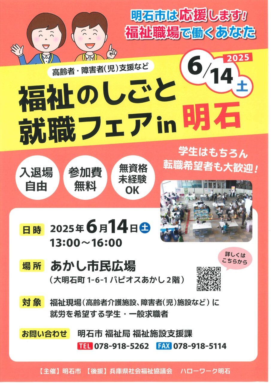 【明石市主催 6/14(土)】福祉のしごと就職フェアin明石に出展します! 2025 5/15 お知らせ お知らせ ホームページをリニューアルしました!! ~6月施設だより~ 関連記事 【年末年始休業のお知らせ】 2025年12月5日 🆕🌟ホームページ・採用サイトがリニューアル🌟🆕 2025年10月22日 10/19(日) 兵庫 福祉の就職説明会に出展いたします!!! 2025年10月1日 ~6月施設だより~ 2025年6月20日 ホームページをリニューアルしました!! 2025年5月1日 1月施設だより 2025年2月12日 【終了済み】【重要なお知らせ】電話機の交換工事 2025年2月5日 【福祉の就職総合フェア in Hyogo】に今年も参加いたします! 2025年1月23日