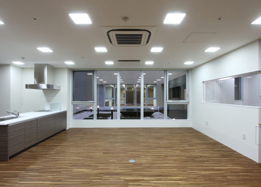 設備個室、リビング、浴室、特浴者用機械浴室、洗濯室、トイレ、医務室、機能訓練スペース、多目的室
